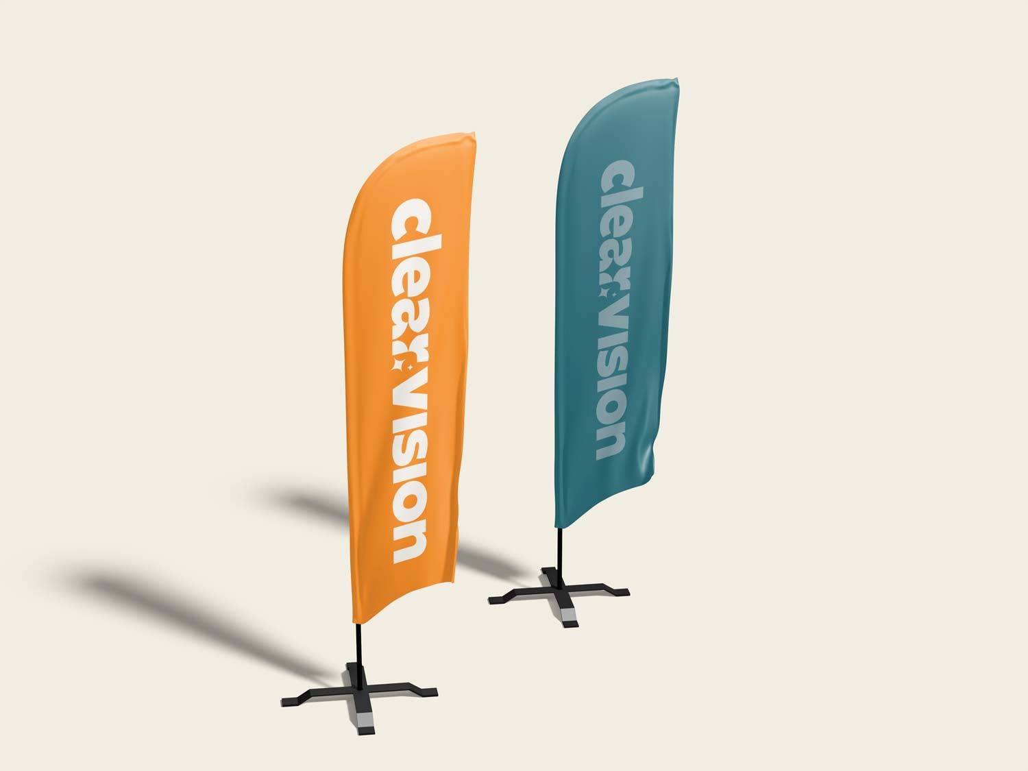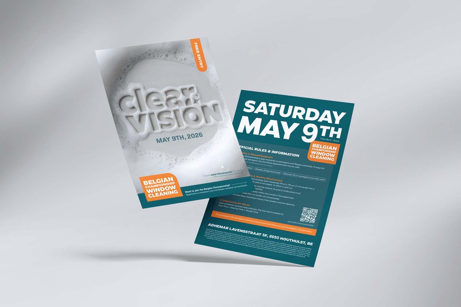 Voor Clear Vision werden verschillende grafische dragers uitgewerkt. De flyer werd opgevat als een informatief stuk dat breed verspreid kan worden, zowel via bestellingen bij Ramenwasser Depot als via exposanten zelf. Door bewust ruimte te laten voor een stempel of sticker van exposanten, wordt de flyer ook voor hen een bruikbaar communicatiemiddel. Daarnaast werden vlaggen ontworpen voor permanente inzet op het terrein, zodat Clear Vision ook fysiek zichtbaar en herkenbaar aanwezig is.